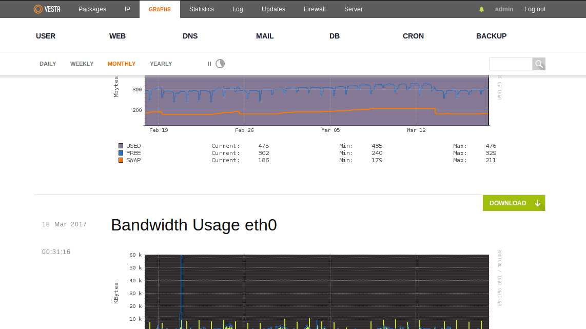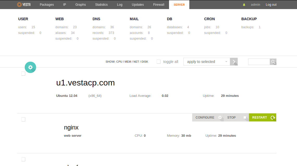 Monitor your server's CPU, memory, and disk usage. Keep track of your server's performance and get alerts when your server is overloaded or running out of disk space